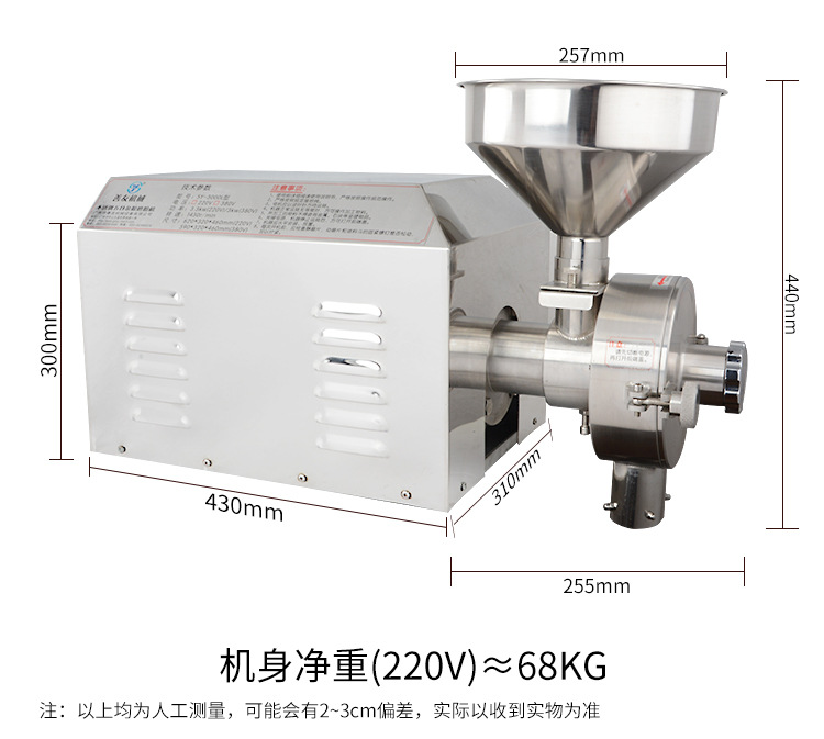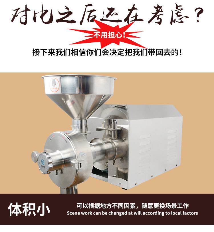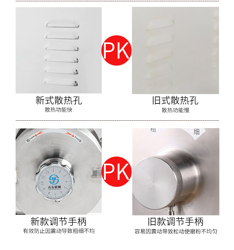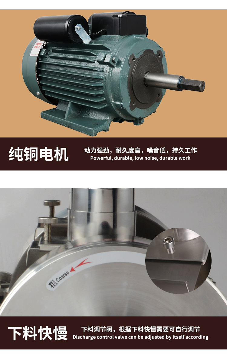 1. 整机不锈钢机体增加了钢材的刚性和厚度,有效控制了磨粉时摩擦产生的噪音扩散,从而降低磨粉时的噪音。