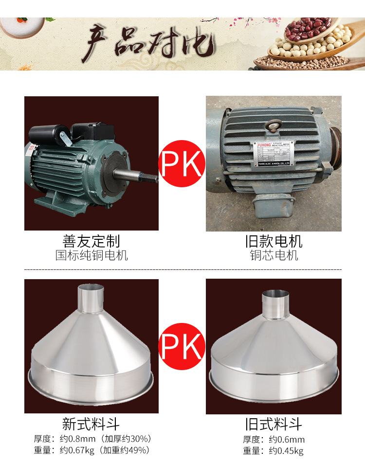 广州市善友机械设备有限公司是最早研制五谷杂粮磨粉机的生产厂家,公司技术部门一直致力于五谷杂粮磨粉机的不断改进和升级,在操作性能、质量稳定、进料顺畅、磨粉细度、降低噪音和震动、外表美观度等方面都力求精益求精、至善至美!从1500型号五谷杂粮磨粉机面世以来,我们的机器就被很多同行主要是一些小作坊模仿,图片也被许多同行、经销商疯狂复制,用来欺骗广大客户以谋取利益,请广大客户注意鉴别